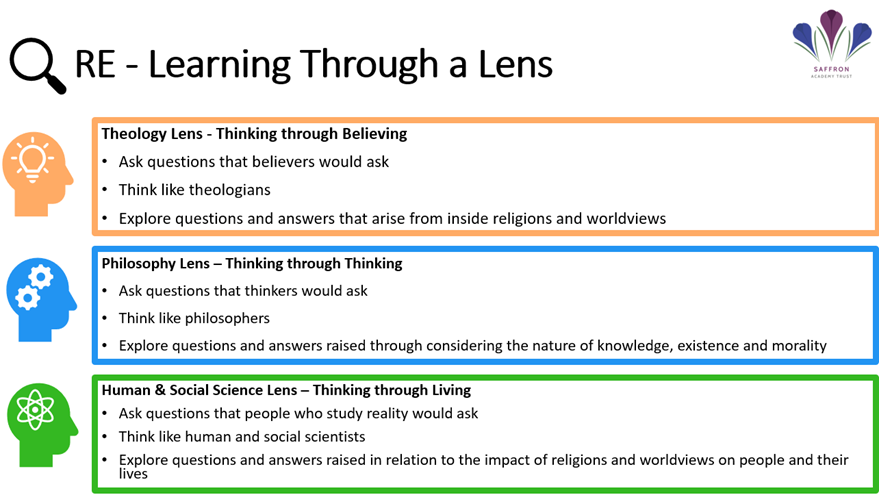 We follow the Saffron Academy Trust (SAT) RE Scheme. In line with and recommended by the Essex SACRE 2022 Syllabus, the SAT RE Scheme explores Religious Education through three distinct lenses.
